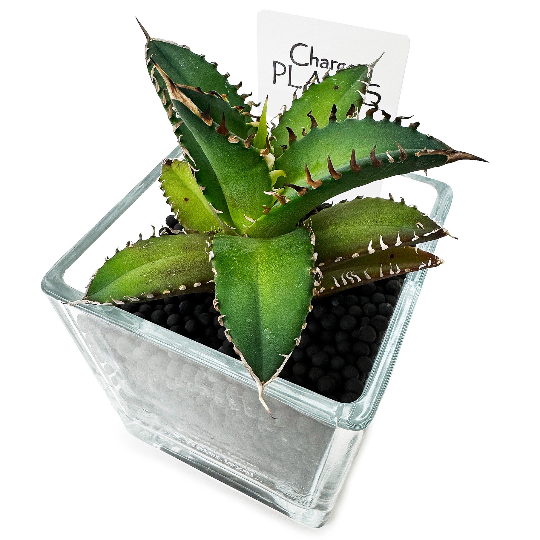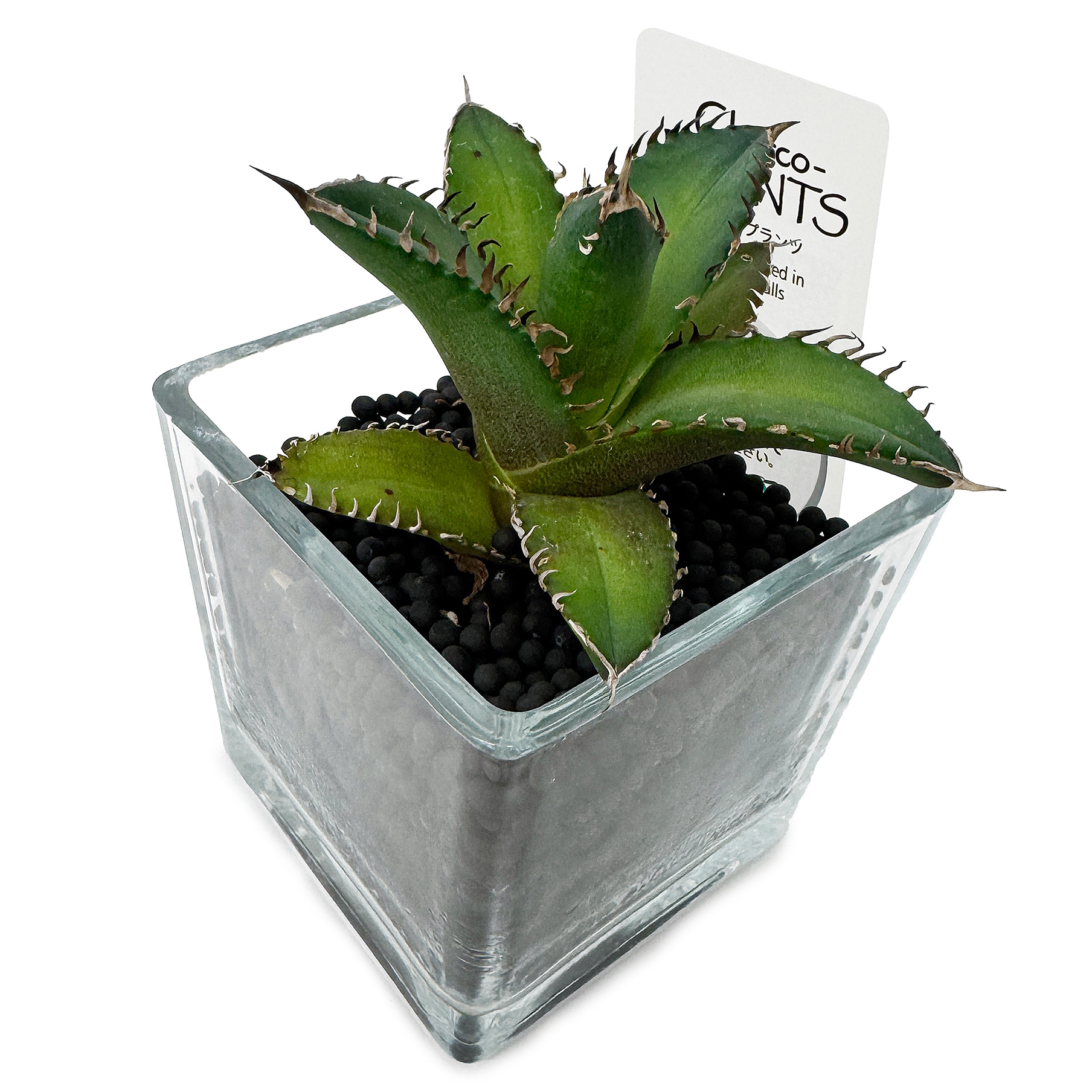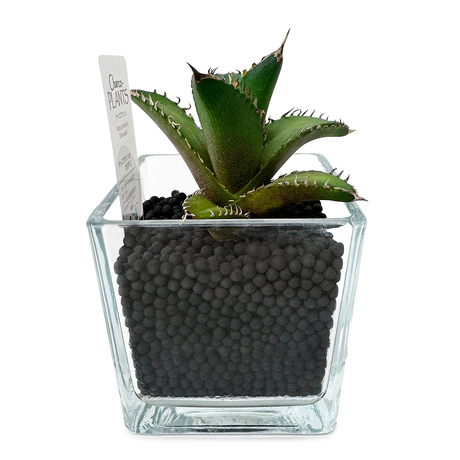 水やり:ウォーターレベルまで一度入れたら、なくなったら再度入れる繰り返しあげてください。冬はアガベガ休眠状態になるため寒い時期は少なめで問題ありません。特徴 鋸葉は炎のように厳つく上へ向かって育ち、葉の裏側からは棘が出るのが特徴、光をしっかり当てて育てていくと株が赤く色づく姿も美しく人気のポイントです。葉の形は基本的に縦長に成長しますが水と光をうまく調整すると短葉で低重心の姿に育成できるのも楽しみの一つです。 器素材 ガラス ポットサイズ H75mm×W75mm×D75mm 価格 ¥4,070(税込)+送料